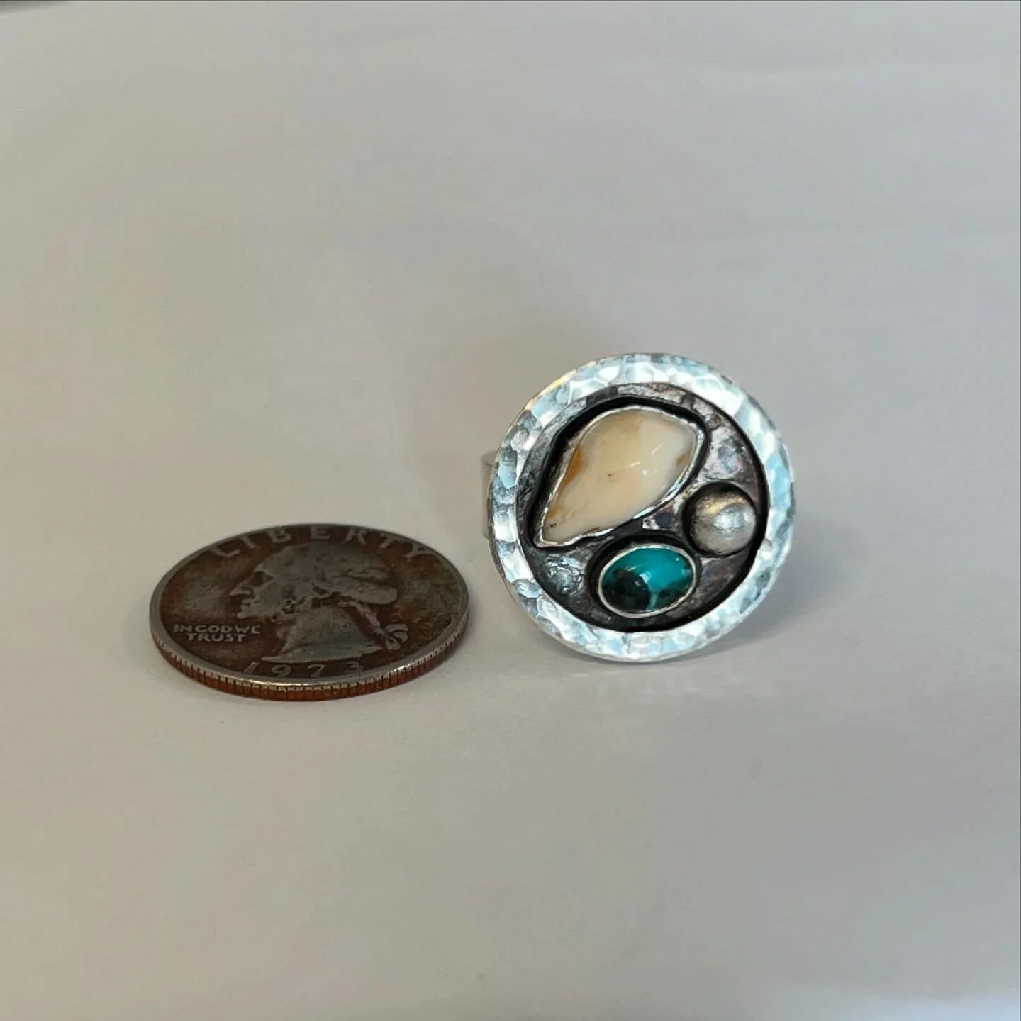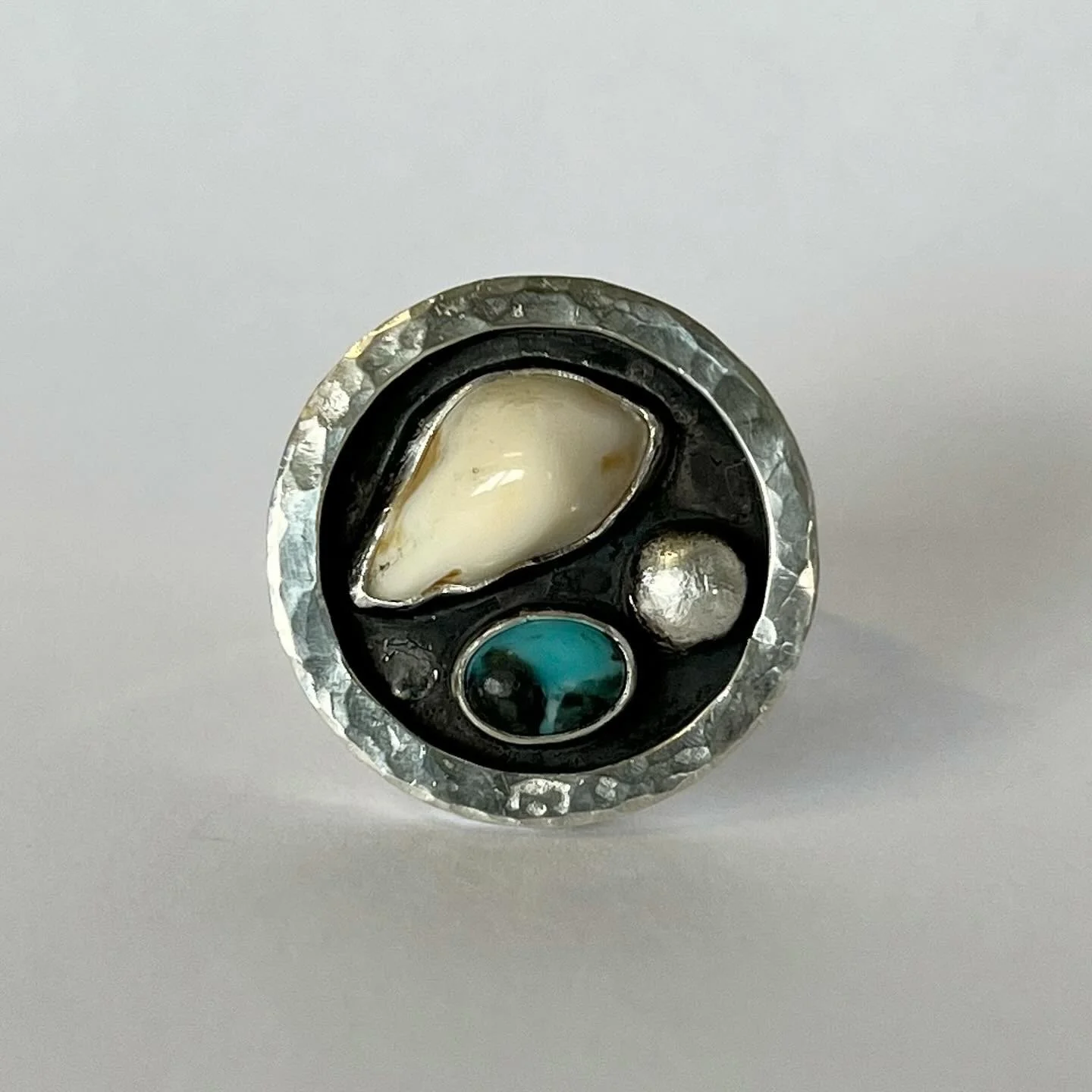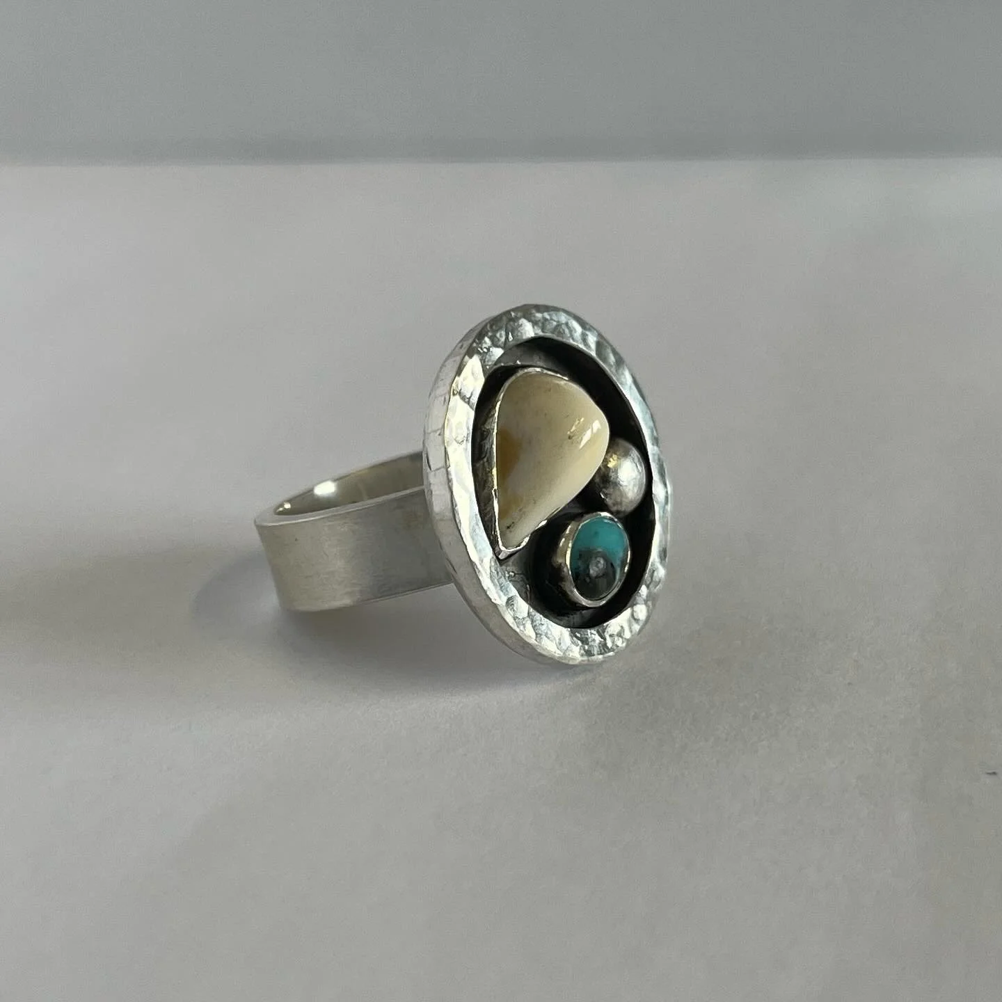 This ring was handmade by silversmith Meagan Anderson, and features an elk ivory a piece of Morenci turquoise, and a recycled button of fine silver set in a shadowbox style top.